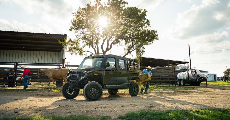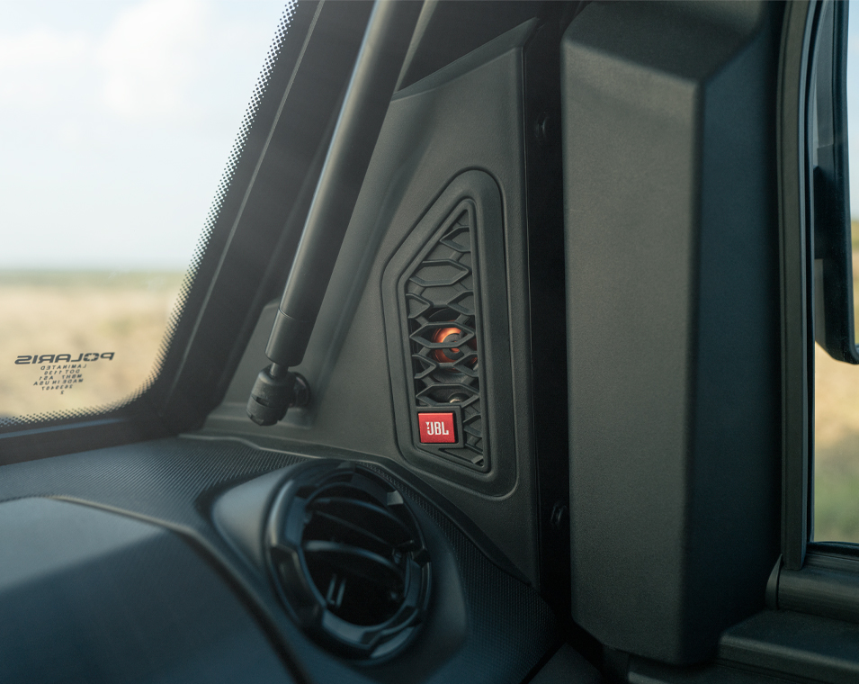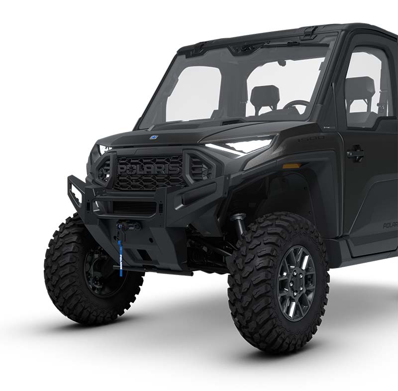 - Factory-installed cab system with powered doors, roof, tip-out glass windshield, glass rear panel, rearview mirror, windshield wiper/washer, and sound insulation materials, Factory-installed heat, AC, defrost, recirculation with 5 different airflow settings, Speed limiting controlled in RIDE COMMAND, 140-amp charging system, Polaris PULSE electrical system (3-position hood and 3-position roof), USB charger, trickle charger, 12-volt accessory outlet, battery trickle-charging port, Pro Series 2,722 kg Winch with synthetic rope, Auto Stop, wireless remote and Rapid Rope Recovery, Large steel bumper, full-coverage skid plate, bumper D-rings, and top bar