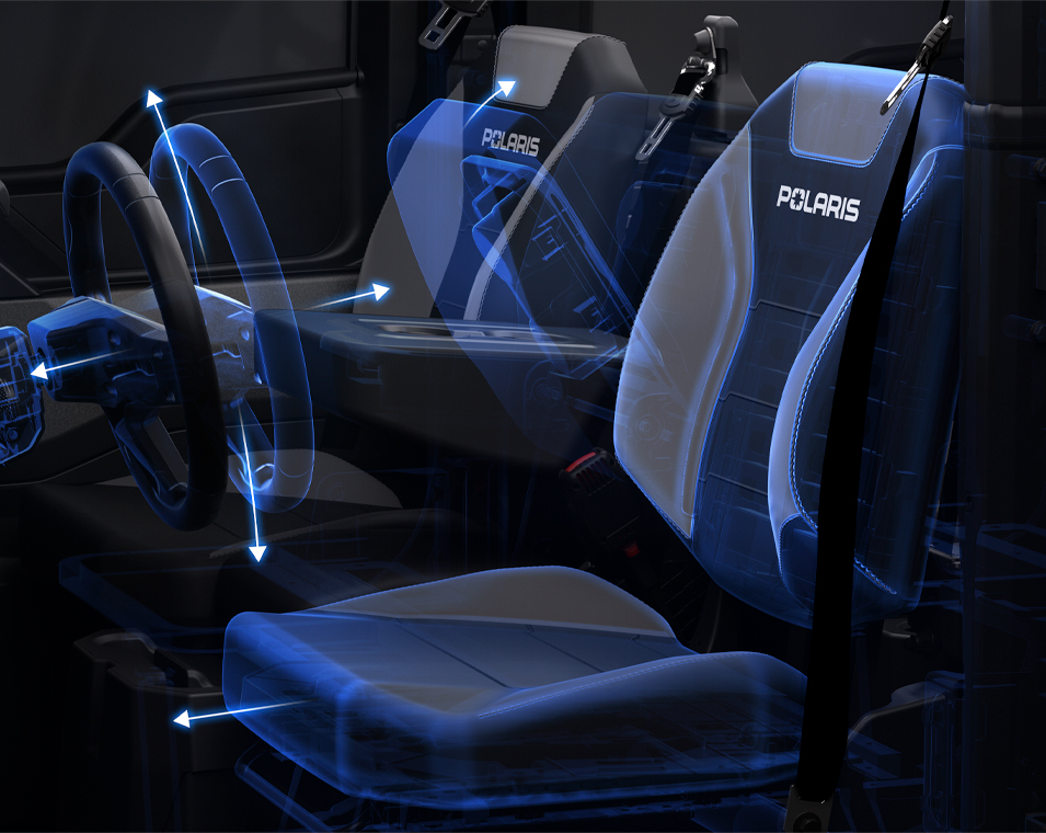 - 3-person, superior contoured and bolstered bench seat with 3-point harness, adjustable driver seat, and flip-down arm rest